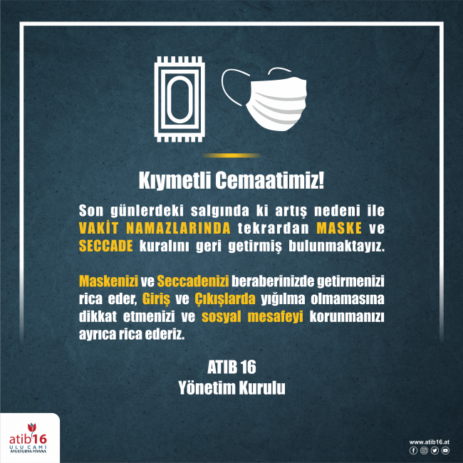 Son günlerdeki salgında ki artış nedeni ile VAKİT NAMAZLARINDA tekrardan MASKE ve SECCADE kuralını geri getirmiş bulunmaktayız.